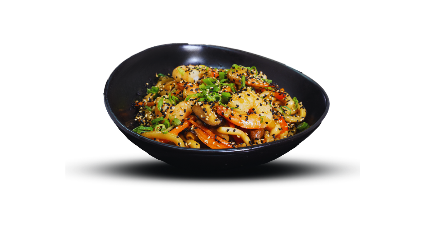 Tigergarnelen, Paprika, Möhren, 3 Pilzsorten, Sojasprossen, Zwiebel, Soja-Soße, Sesam
