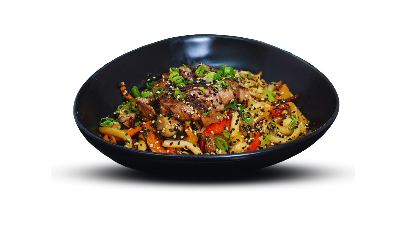 Lachs , Paprika, Möhren, 3 Pilzsorten, Sojasprossen, Zwiebel, Soja-Soße, Sesam