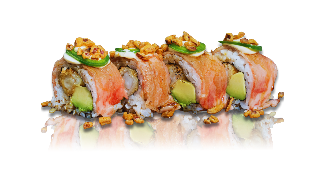 Zarte Avocado,knusprige gebratene Tempura-Garnelen,edles Wagyu Rind A5-Qualität aus Japan,verfeinert mit einer japanischen Sauce,frischen Jalapenos,Soja-Knoblauch-Mayo und gerösteten,pikanten roten Zwiebeln